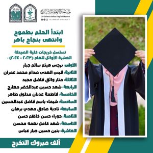 تهنئ عمادة كلية الصيدلة وكادرها التدريسي الخريجات العشرة الاوائل للعام 2023_2024 متمنين لهم دوام التوفيق والنجاح