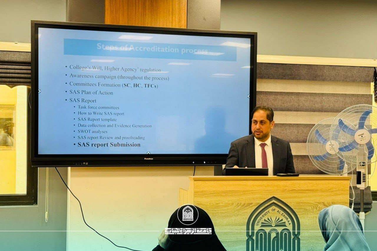 عقدت كلية الصيدلة في جامعة الزهراء (عليها السلام) للبنات، ورشة علمية حول (برنامج الاعتماد البرامجي لكلية الصيدلة)، حاضر في الورشة الدكتور احسان صلاح/ عضو مجلس اعتماد كلية اللجان وعضو مقيم وطني في برنامج كليات الصيدلة في العراق.