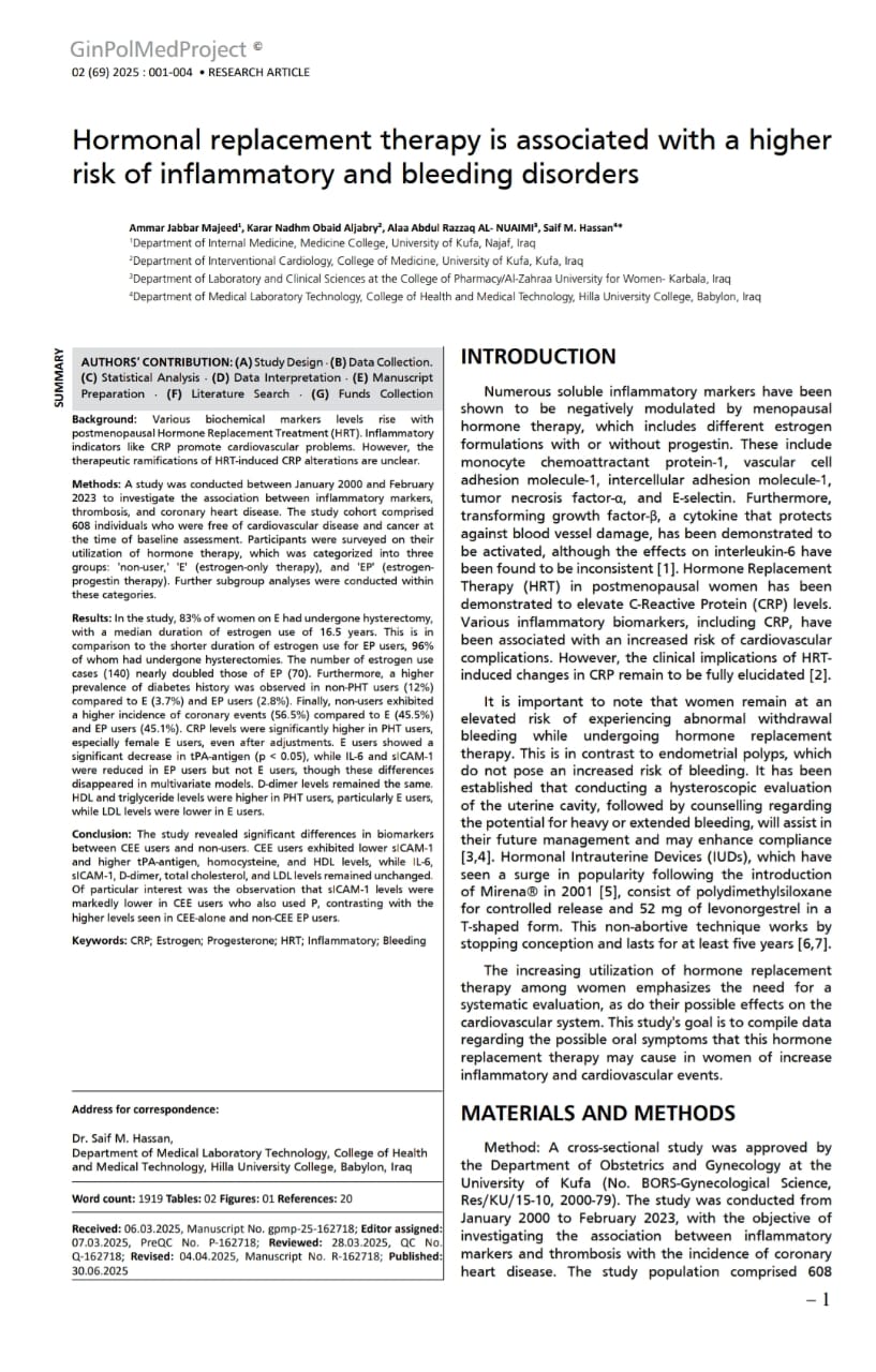 نشر الأستاذ المساعد الدكتور علاء عبد الرزاق محمد حسين، التدريسي في كلية الصيدلة بجامعة الزهراء للبنات، بحثًا علميًا رصينًا في مجلة GinPolMedProject، إحدى المجلات العالمية المصنفة ضمن مستوعبات سكوبس. تناول البحث العلاقة بين العلاج الهرموني البديل (Hormonal Replacement Therapy) ومخاطر الإصابة بالأمراض الالتهابية واضطرابات النزيف.