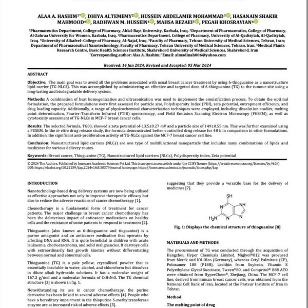 تدريسي في كلية الصيدلة بجامعة الزهراء للبنات ينشر دراسة عن توصيل علاج سرطان الثدي باستخدام تقنية النانوUniversity Of Al-Zahraa25 مارس، 2025نشر الدكتور ضياء رحيم التميمي، التدريسي في كلية الصيدلة بجامعة الزهراء للبنات، بحثًا علميًا في مجلة International ... اقرأ أكثر