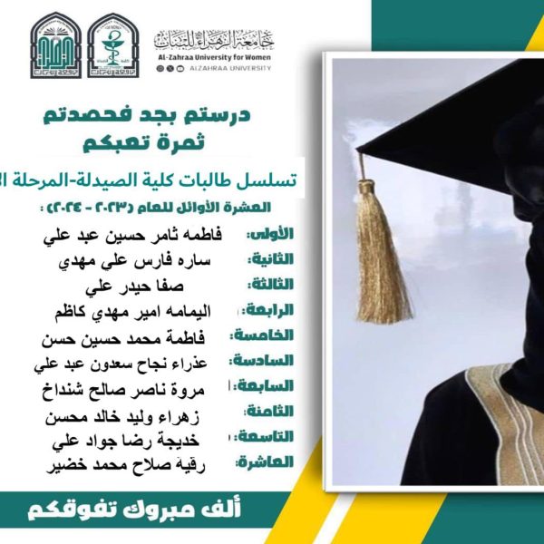 طالبات المرحلة الأولى العشرة الاوائل للعام 2023_2024Alzahraa14 سبتمبر، 2024قُل بِإسمِ ربِّ الكونِ نَبدأُ سَيرنا . . وَلهُ نفوِّضُ أمرَنا وَنسلِّمُ ..” تهنئ عمادة كلية الصيدلة ... اقرأ أكثر