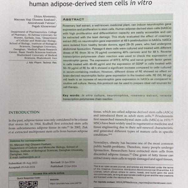 New method to induce neurotrophin gene expression in human adipose‐derived stem cells in vitroAlzahraa14 سبتمبر، 2024تم نشر البحث الموسوم ( New method to induce neurotrophin gene expression in human adipose‐derived stem cells ... اقرأ أكثر