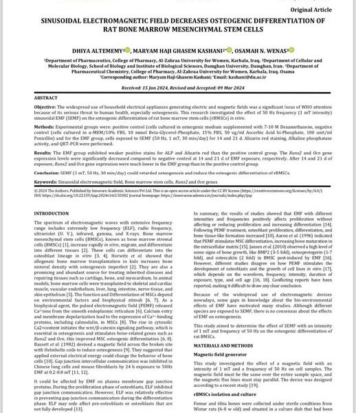 تم نشر البحث الموسوم( SINUSOIDAL ELECTROMAGNETIC FIELD DECREASES OSTEOGENIC DIFFERENTIATION OFRAT BONE MARROW MESENCHYMAL STEM CELLS)من قبل ... اقرأ أكثر