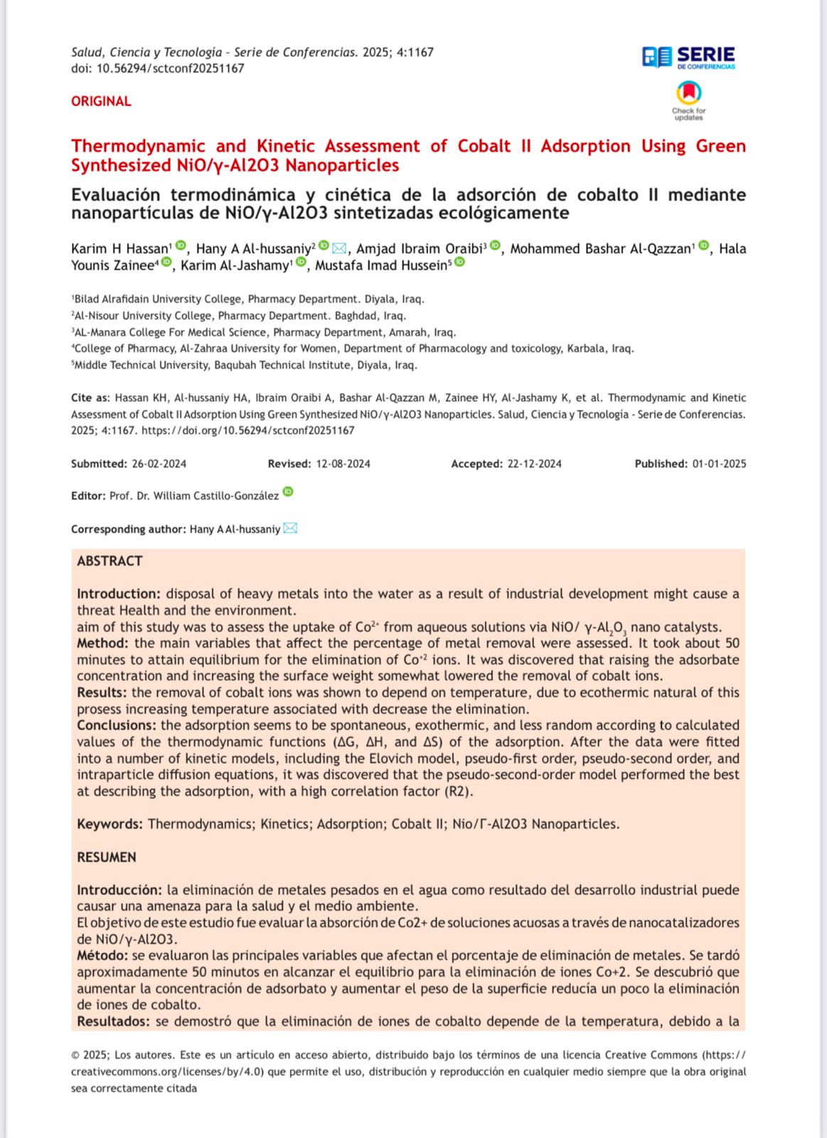 يتناول البحث مشكلة التخلص من المعادن الثقيلة في المياه الناتجة عن التطور الصناعي، والتي تمثل تهديدًا للصحة العامة والبيئة. وهدف البحث إلى تقييم عملية امتصاص أيونات الكوبالت (Co²⁺) من المحاليل المائية باستخدام محفزات نانوية من نوع NiO/γ-Al2O3 المحضرة بطرق صديقة للبيئة.