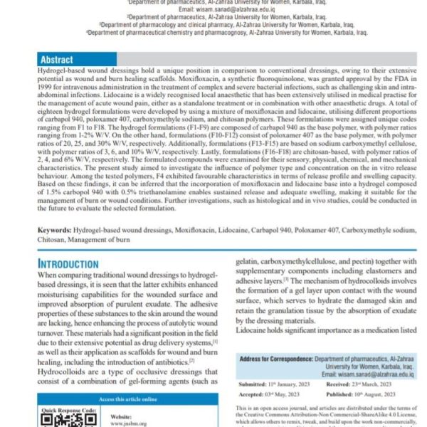 Formulation and in-vitro evaluation of Moxifloxacin-Lidocaine base as a topical hydrogel dressingAlzahraa13 November، 2024Formulation and in-vitro evaluation of Moxifloxacin-Lidocaine base as a topical hydrogel dressing من قبل التدرسي ( م.م ... Read more