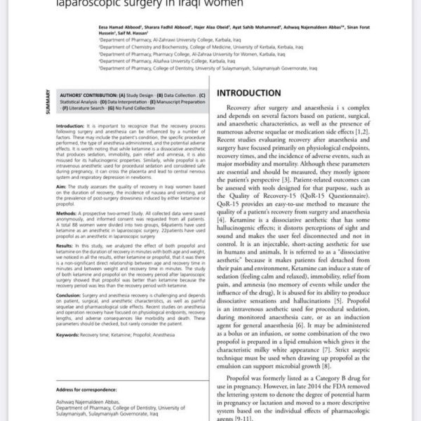 Impact of ketamine or propofol on quality of recovery after laparoscopic surgery in Iraqi womenAlzahraa13 November، 2024تم نشر البحث الموسوم ( Impact of ketamine or propofol on quality of recovery after laparoscopic surgery ... Read more